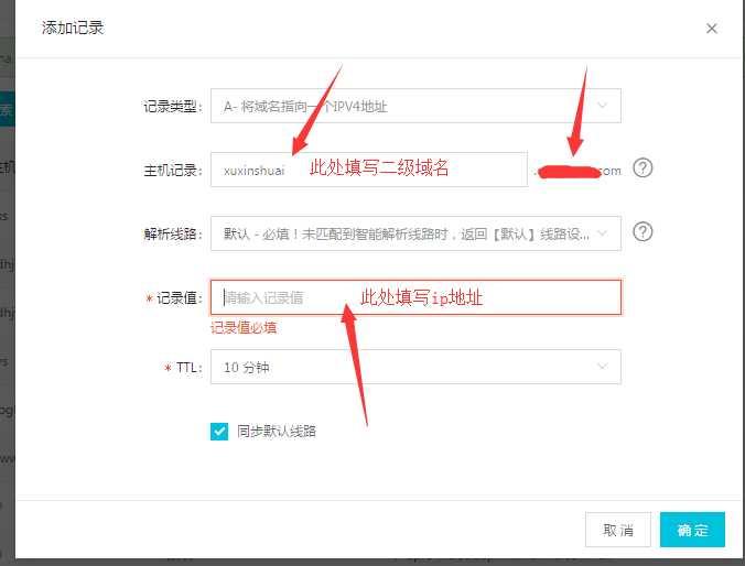 2、點(diǎn)擊添加記錄后,根據(jù)所彈窗給出的框條寫上即可,記錄類型選擇A即可,主機(jī)記錄可以看旁邊的一個(gè)問號(hào)有所提示,根據(jù)自己所需填寫,最后就是記錄值,填寫你的服務(wù)器IP或者空間IP即可,在確定就完成了二級(jí)域名設(shè)置。